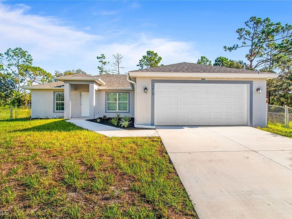 Brand New Construction 4beds + Den /3 Baths / Fully Fenced / Priced to Sell ! This beautiful new home features 4 bedrooms , a den , and 3 bathrooms with a spacious split floor plan. The kitchen includes quartz countertops, white shaker cabinets, and stainless-steel appliances, plus a washer and dryer. Enjoy title floors throughout, with carpet in the bedrooms and den. The master suite offers his-and-hers walk-in closets, dual sinks, and a frameless glass shower. Outside, enjoy a screened lanai, epoxy garage floor, fully fenced yard, and beautiful landscaping that adds charm and curb appeal. Seller is helping with closing costs! Don't miss this great opportunity-priced to sell! These pictures are of a similar model.