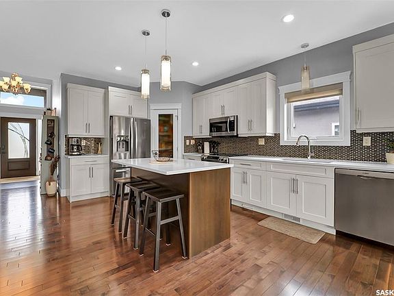 Welcome to this stunning walkout bungalow backing onto the park in Warman, where over $60,000 in recent upgrades have elevated this home into something truly special. From the moment you step inside, you’ll be impressed by the spacious layout, elegant finishes, and natural light throughout. The main floor features a grand front entrance, a high-end kitchen with an oversized island, and a warm, inviting living room with a gas fireplace. The large primary bedroom includes a luxurious five-piece ensuite, while a second bedroom, dedicated office space, main floor laundry, and a breathtaking deck overlooking the park complete the level. The walkout basement offers a spacious family room, games area with a bar, two generous bedrooms, and a full bathroom. The beautifully landscaped backyard includes a lower patio, stonework, and two storage sheds. A heated double garage with 10-foot ceilings adds practicality to the home’s charm. Upgrades include luxury vinyl plank flooring in the basement, new upgraded carpet on the main floor, solar-block tinted windows in the main floor living room,right side patio door as well as the basement family room right side, a custom front door, refreshed master bath with new taps and paint, front and lower decks, brick flowerbeds, and custom blinds in the basement. With its thoughtful design, serene park views, and turn-key updates, this home is the perfect blend of comfort and elegance ready for you to enjoy. This beautiful home is close to the schools, Warman community centre, and all other amenities.