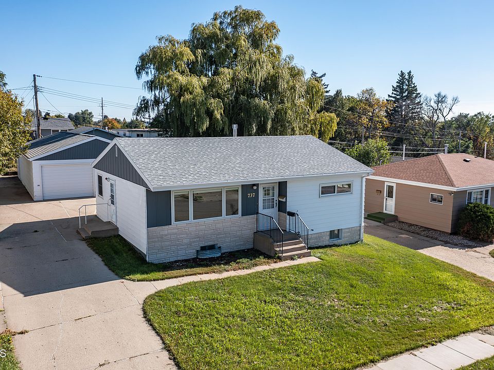 4-STALL GARAGE! This charming property offers just that — and it's ready for your personal touch! The big-ticket updates are already complete, including a newer roof (2020), new furnace (2021), steel siding, and two remodeled tub/shower units. The oversized 24x44 (1,056 sq ft) detached garage is a showstopper — fully insulated, equipped with a natural gas heater, and paired with an extra 10.5x44 RV pad for additional parking or projects. Whether you're into cars, hobbies, or just need serious storage, this space delivers! Inside, you'll find 2 bedrooms on the main level, 1 additional bedroom downstairs, beautiful hardwood floors in the bedrooms and living room, and a large family room perfect for gatherings or relaxing evenings. Bring your vision and make this home your own — or a great investment opportunity. Call your favorite agent today!