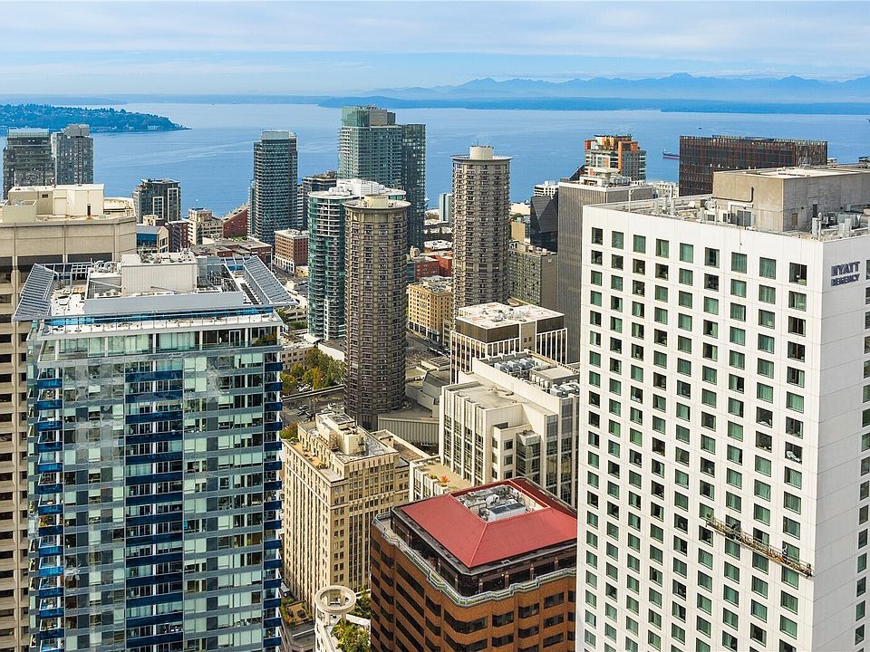 Get ready to be mesmerized by panoramic views of Downtown Seattle, Puget Sound & the Olympics through a wall of windows. Remarkable location at the renowned Olive 8 - central to everything Downtown Seattle has to offer. Large open living w/vaulted ceilings, gourmet chef's kitchen, pantry, office space, open dining, electric fireplace, spacious outdoor deck & custom built Murphy bed in the main living space. Separate primary bedroom area is private & features vaulted ceilings, custom oak cabinetry & slider doors. Bathroom has all the luxury finishes & too many to list. New HVAC system ($12K+), New W/D & much more! Unit also comes w/one parking space, one storage unit, owner's lounge & other Hyatt Hotel offerings. A must see & experience!