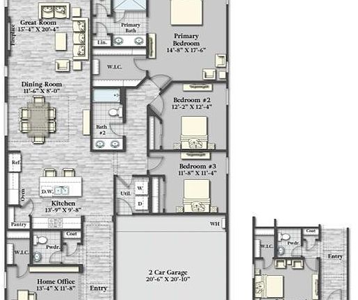 At the heart of Aidan-II lies a gourmet kitchen, equipped with a pantry and center island that overlooks the inviting dining room. Directly ahead, there is a large great room, featuring a fireplace that comes standard. This delightful home includes two sizable bedrooms, with a beautiful primary bedroom and private bath with walk-in closet. Other standout features is the flex room off of the spacious entry that can be optioned into a fourth bedroom, if desired.