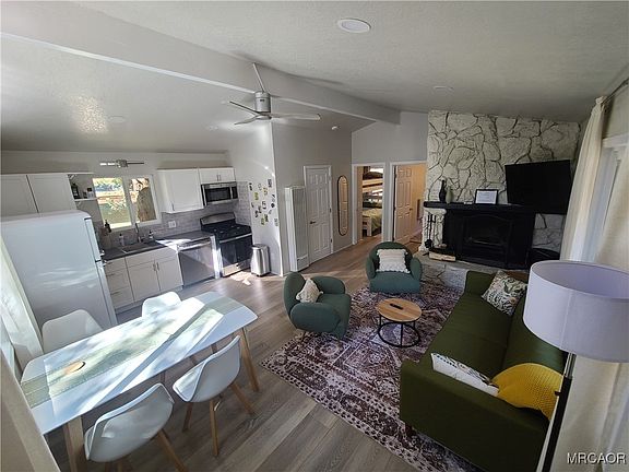 Freshly remodeled modern and enchanting cabin nestled in the woods, where tranquility meets adventure! Features an ideal open concept layout, with new high quality composite floors everywhere. The whole house has been painted inside and outside. New kitchen - backsplash, cabinets, shelving, countertop, lights and high end appliances. Fully furnished with a smart tv and cozy fireplace. Fully renovated bathroom with new plumbing, toilet, vanity, tile and shower. New electrical water heater. New wall gas heater in the living room with NEST. New electrical wall heaters with thermostats in each bedroom. New ceiling fan in the living room. New lightning throughout the house and outside. Repainted functional wood burning fireplaces. Brand new composite front patio. Refinished back patio. Solar powered WIFI security cameras 2 in front and 1 in the back. New insulation installed underneath the house. Adjacent to the National Forest, experience the perfect blend of privacy, comfort and wilderness at this woodland Cabin! This cabin has been a very successful short term rental property.