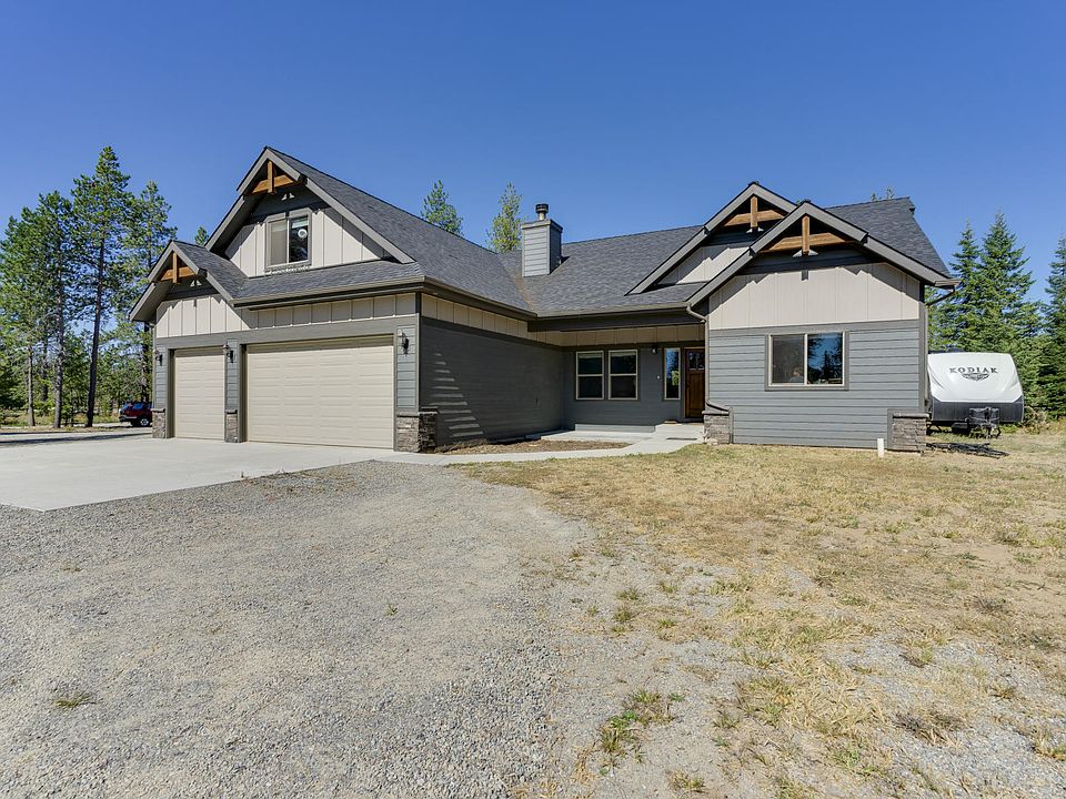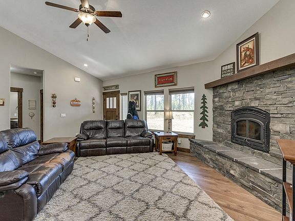 Enjoy privacy and elegance in this stunning 3415 sq.ft 3 bedroom 3 bath home with bonus rm (or 4th Bed) located in the desirable Timbered Estates! Built in 2016, this home is nestled in the pines on nearly 5 acres and features a 30x40 covered storage building plus numerous water spigots throughout the property. Luxury features include granite countertops, vaulted ceilings, a real stone surround fireplace and laminate and carpet throughout. Spacious master suite with private bathroom featuring a tiled walk-in shower and large soaker tub. This home has large unfinished basement with a finished bathroom. Enjoy paradise in your own backyard in this tranquil setting with RV parking & so much more!