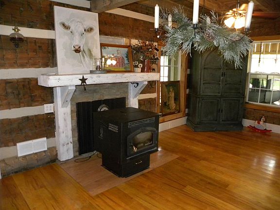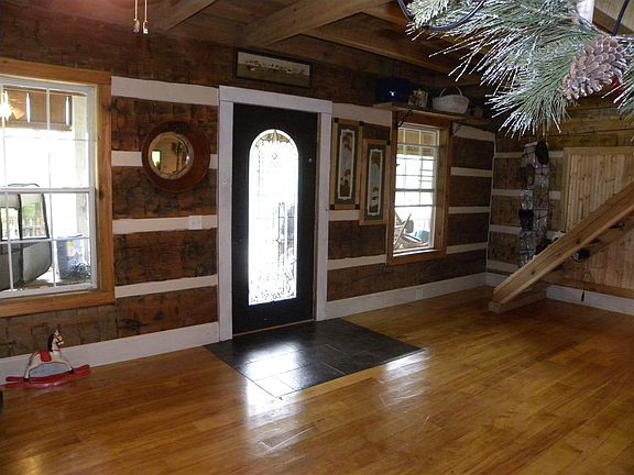 Cozy log cabin and 2.74 Acres of land with a nice big pond and pole barn. The cabin with its white picket fence and big front porch, sits back off the road and overlooks the pond and beautifully landscaped property. This custom built cabin is just a show stopper with beautiful hardwood floors and rustic interior. It has a huge gathering room with a fireplace with a pellet stove. The kitchen has nice appliances and a cast iron sink. There is a single bedroom on the upper level. The area is all open with soaring ceilings and big windows. The home is very unique and charming with lots of space to rearrange if you don't like the current arrangement. The furnace is gas with a woodstove back up. The property has city water, the propane tank is owned and the pole barn is 30X50 with a gravel floor and electricity.