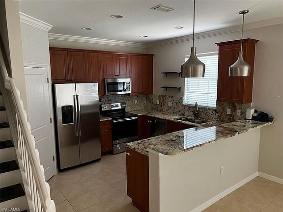 11/16/23 -Back on the market due to Buyer cancellation from unforeseen events. Immaculate and well appointed 3 bedroom townhome in desirable North Naples Bristol Pine neighborhood.This home features tile flooring on the lower level and bathrooms, bamboo wood floors on the upper level , crown molding throughout the home, granite countertops, stainless steel appliances, ceiling fans in every room, 1 car garage, spacious screened lanai with rollout shade, brick paver driveway and so much more. Water heater replaced in 2022 and AC unit approx 5 years old. Community amenities include tennis courts, basketball courts, playground, resort style pool, clubhouse, walking paths and gated entrance with security.