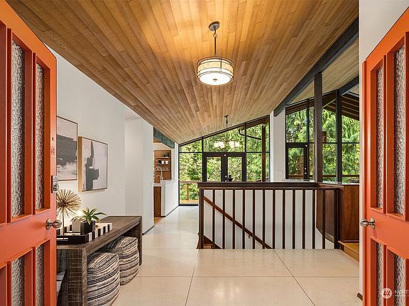 Nestled in a peaceful cul-de-sac, this updated, dramatic Fischer-built mid-century modern delights. Its walls of windows and soaring ceilings complement lush, natural scenery. Gather around the stone-framed fireplace or host parties in the adjacent dining area with French doors opening to an expansive deck. Remodeled in 2014, the kitchen is the heart of the home with three islands, a walk-in pantry, and built-in Wolf/Miele/SubZero appliances. A casual eating area and family room are just beyond. Six bedrooms, including serene primary suite + rec room provide ample flex space. Don’t miss guest apartment with its own kitchen & living area. Extras include a whole house generator, fenced pet area, 3-car garage. Near schools, parks & shopping!