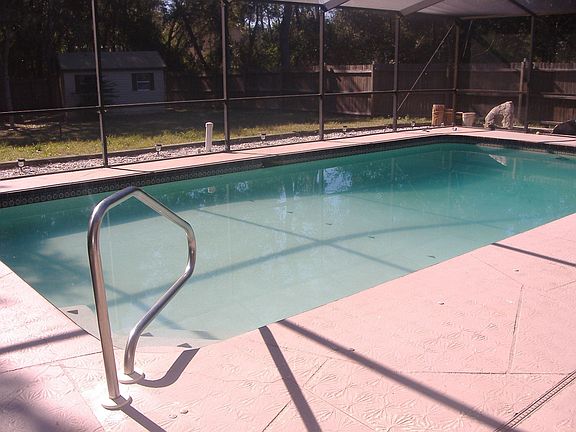 Pride of Ownership Shows Here! Curb appeal grabs you with the Mediterranean style entryway with archways and columns! Once inside you'll be greeted by a spacious great room with french doors that lead to the covered lanai. The remodeled kitchen overlooks the main living area and is complete with stainless steel appliances, lots of cabinets and an adjacent dining area. This home features 3 bedrooms and 3 full bathrooms, 2 of which have been updated. One of the bathrooms gives access to the pool area! There is laminate wood flooring throughout most of the home and ceramic tile in the kitchen, dining and bathrooms - no carpeting! Enjoy Florida Living out in the beautiful large screen enclosed salt water pool. There is a separate covered patio off the master suite. Backyard is fenced and has a storage shed with electricity. Act Quickly...Call today!