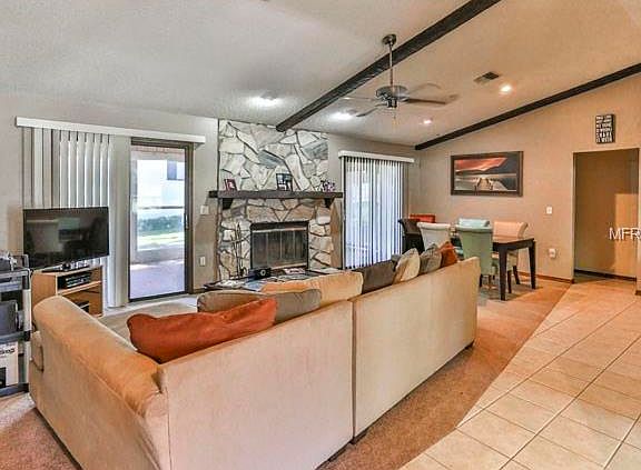 Two Words: Must See! Great location with the view from the front overlooking a pond. This open great room floor plan features a wood burning fireplace for the occasional chilly night, vaulted beamed ceiling, large eat in kitchen with lots of wood cabinets, newer appliances, breakfast bar, bay window with a great view, 3 bedrooms, 2 1/2 bathrooms, inside laundry room and pantry. Entertaining is made easy with the sliding glass doors off the living area that open onto the spacious all weather Florida room with a separate 1/2 bath. New Roof and A/C, both in 2014! All this located in the Golf Course Community of The Heather with low HOA fees!