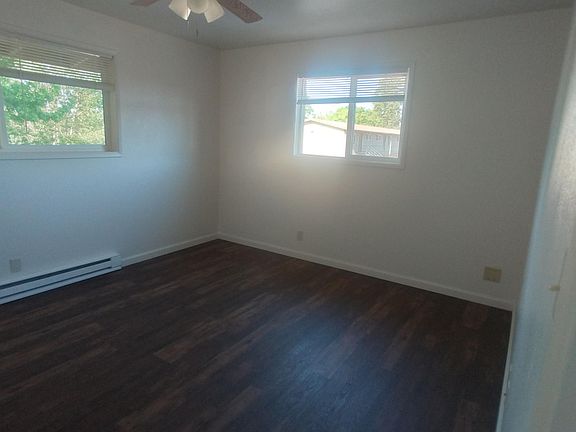 Nice, clean 2 bedroom and 1 bath unit upstairs. Vinyl flooring throughout. Ceiling fans in bedroom's and dining room. Mini blinds in both bedrooms, kitchen, dining room and living room. Kitchen has refrigerator, stove with hood/oven. Heating is electric baseboard's. There is on site parking and a shared coin-op laundry facility. Owner pays water/sewer and garbage. Tenant is responsible for paying own electricity. One small pet may be considered with additional deposit. This is a non-smoking unit. Close to down town shopping, bus stops and venues.