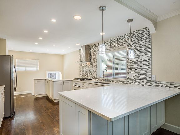 Dark stained hardwood floorsSmall garden areaNew kitchen cabinetsStainless steel appliancesAutomatic sprinklers for yardWhite quartz countertops