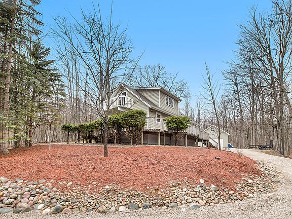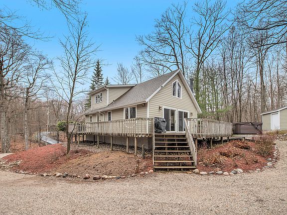 This is your opportunity to own a meticulously maintained up north home with lots of privacy. Would also make an excellent investment for a VRBO. stainless steel appliances, tongue and groove pine throughout inside, natural gas fireplace, Hardy Board Siding that never needs to be painted, wrap around porch, 30'x25' detached garage heated with bunkhouse above it. Relax and enjoy the stars from the hot tub. Live the life you deserve.