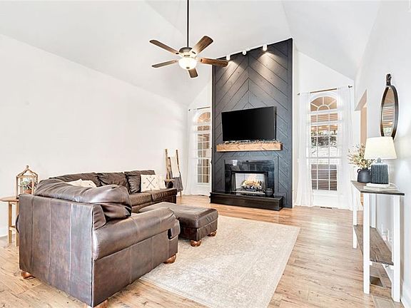 Finished basementDesigner shiplap fireplaceFour-sided brick ranchFlex spaceDedicated officeWalls of windowsHome gym