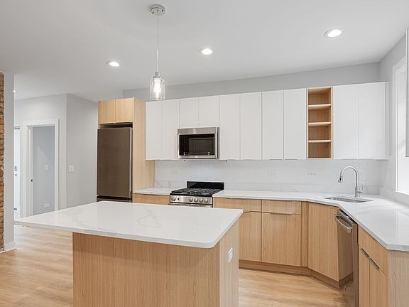 Two Toned Kitchen Cabinets Quartz Countertop with Deep Undermount Sink Stainless Steel Appliances including Dishwasher Bright Light-Filled Kitchen Exposed Brick Feature Walls Ceiling Fans with LED Lighting Designer Plank Flooring In Unit Laundry Heat & Water Included Pets Welcome (No pet rent!) Photos of similar unit.