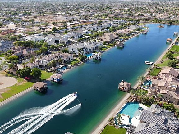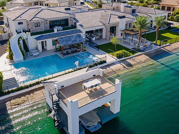 Impeccable 6-bedroom, 8-bath, 11,800 sq. ft. custom estate offers a stunning blend of luxury and modern elegance on a pristine 1-acre lot within the prestigious San Tan Lakeside Estates. Set against the backdrop of breathtaking mountain views, this waterfront property boasts a private 13-acre ski/wake/paddleboard lake and 236ft of lakefront beach. The home features expansive sliding glass wall panels that open on two levels to reveal panoramic lake views, seamlessly merging indoor and outdoor living spaces. Inside, a chef's dream awaits with a gourmet kitchen outfitted with high-end finishes, two oversized kitchen islands, wine room, and a butler's pantry. The upstairs entertainment bar and game room includes a second kitchen, , and abundant indoor and outdoor seating perfect for hosting guests. All six bedrooms offer en-suite bathrooms, ensuring privacy and comfort for everyone. The master suite's spa-like bathroom is a true retreat with luxurious finishes, expansive designer closets, steam shower, and a deep soaking tub.