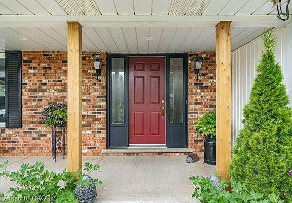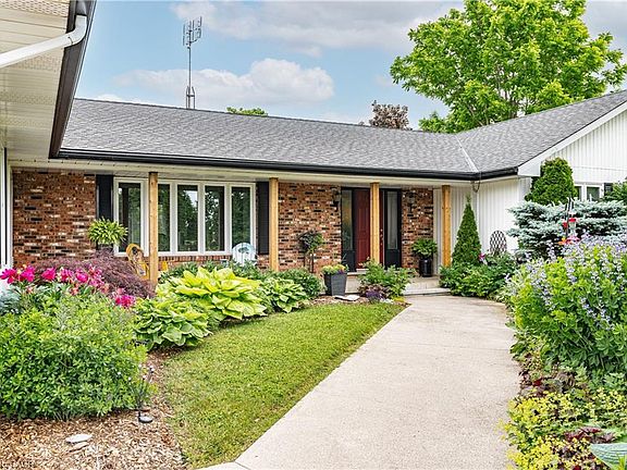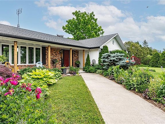 Enjoy country living just 15 Minutes from downtown Burlington, Milton and Waterdown! This extremely well maintained bungalow is situated on approximately one acre country property. The front entrance is graced with a pond and perennial gardens, landscaped concrete walkway and a covered porch. Inside, a large foyer and spacious great room with generous living and dining areas, a wood burning fireplace and a private home office with high speed fibre optic internet. The kitchen layout includes a dinette and breakfast bar, desk area, hardwood flooring and abundant light toned cabinetry. Step out to a recently updated deck with picturesque views. The hallway from kitchen leads to a lovely powder room and laundry/boot room with additional storage and appliances and access to an oversized, insulated, two car garage. The primary bedroom includes a large ensuite with jet tub and separate shower. Two additional bedrooms with large closets and a full bath. The lower level has an additional bedroom, two piece bath, family room and large rec room and an abundance of storage space. A separate entrance and open floor plan makes this an ideal space for extended family members to enjoy. Parking for six cars on double wide driveway.