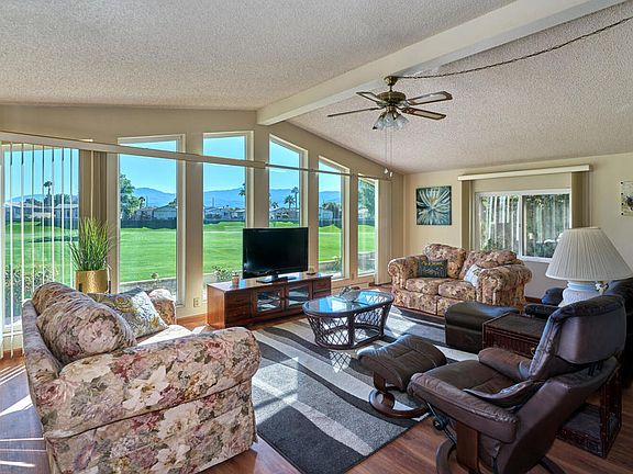 Beautiful golf course home in Tri Palm Estates & Country Club! Located on the highly desirable 5th fairway, this spacious home has been recently updated with new Luxury Vinyl Plank flooring throughout, new Frigidaire convection oven, new interior paint, and water-conserving toilets. Featuring oversized windows to enjoy the breathtaking golf course and mountain views, the home also features a detached garage leading into a private covered patio for perfect outdoor entertaining. Tri Palm Estates is an active 55+ community where YOU OWN THE LAND and where ownership includes FREE UNLIMITED GOLF for 2 deeded owners on the 18-hole and 9-hole par-3 courses, as well as putting green, swimming pools & spas, tennis, pickle ball, shuffleboard, basketball, and use of the community clubhouse with its banquet room, restaurant, bar, billiard room, and organized clubs & activities. Conveniently located near Costco/Sam's Club, Home Depot, the Eisenhower Medical Campus, Agua Caliente Rancho Mirage Resort & Casino, and the new Acrisure Arena, home to professional hockey and world-class concert performers. With easy access to I-10 you're only minutes from the shopping dining & entertainment of Rancho Mirage, Palm Desert, and downtown Palm Springs. Come make this amazing golf course home your desert getaway!