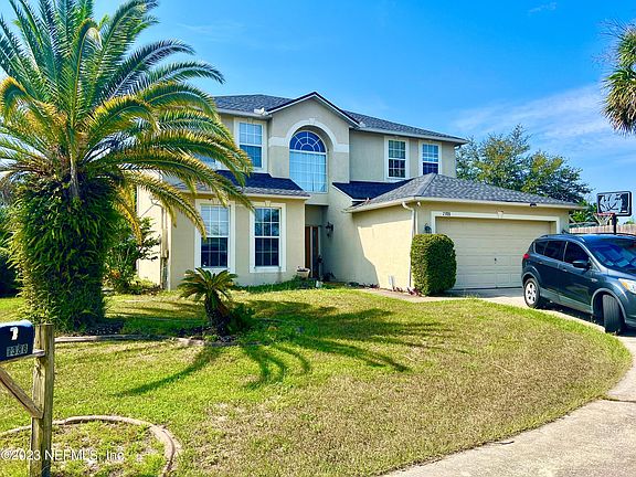 This beautiful stucco two-story 4/3 home is located on a cui-de-sac with a beautiful Florida palm .The foyer has boasts a stunning entrance, Tile and wood floors throughout. Separate LR and DR.,Granite countertops, large great room, beautiful arched entrances, upgraded lighting and fans, large pantry, shower and garden bath in MBR, laundry shoot, 10 ft ceilings and vaulted ceilings, 2 WALK IN CLOSETS IN OWNER'S SUITE, oversized covered patio, 2 car garage,3 year old roof. hot water tank 3 years new. Living here puts you close to amenities, shopping, restaurants and I-295!