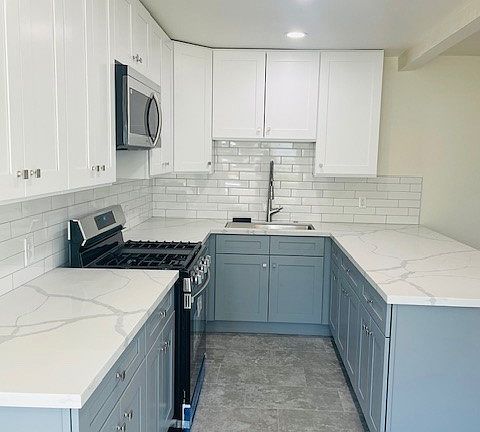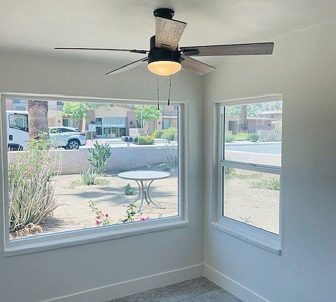 The unit has undergone a complete remodel with brand-new appliances including a refrigerator, microwave, and stove. It boasts tile flooring, fresh paint, a new kitchen and bathroom, new AC unit, new blinds, and updated hardware and ceiling fans.