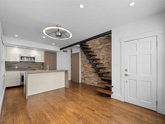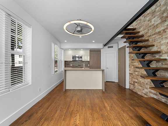 NY-Style Loft in South of Fifth! Step into a one-of-a-kind South Beach gem this two-story NY-style loft blends industrial charm with coastal sophistication. A corner residence wrapped in 18 impact windows fills with natural light, highlighting the exposed brick wall, architectural staircase, and warm wood floors. Features include 1.5 baths, in-unit washer/dryer, and a private entrance that makes it feel like your own house. Set within an intimate boutique building just steps from the beach and Miami's finest restaurants. Rare, stylish, and perfectly South of Fifth.
