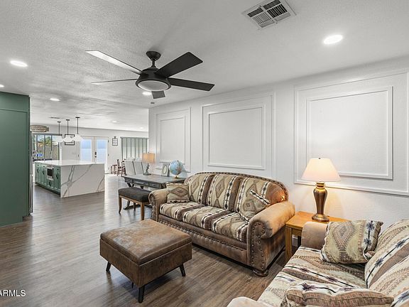 Experience luxury living in this beautifully remodeled 4BD/3BA home in the desirable Sunset Mesa community! Offering 2,466 SF of refined style, this home features an airy open layout with designer finishes, wood-look flooring, recessed lighting, and a cozy fireplace. Stunning waterfall-edge island, quartz countertops, custom cabinetry, designer pendant lighting, stainless steel appliances, a gas stove, and a farmhouse sink in the gourmet kitchen. Enjoy the spa like feel in the serene primary suite with dual vanity sinks, frameless glass shower, and spacious walk-in closet. French doors allow natural light in and open up to a large private backyard retreat with plenty of room for entertaining. This gorgeous home boasts modern functionality inside and low maintenance outside. See it today!