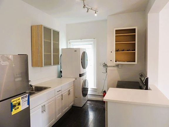 The modern kitchen comes with brand-new appliances (not yet pictured) and the living room is situated above the bustling Elmwood Avenue, making it perfect for cooking and entertaining. Enjoy the convenience of in-unit laundry with a stackable washer and dryer, eliminating trips to the laundromat.