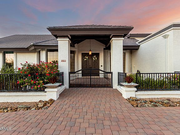 Step into over 5,000 sq. ft. of versatile and dramatic living space with soaring ceilings and breathtaking mountain views. Black Mountain graces your windows, framing your entertainer's backyard perfectly. The open floor plan flows effortlessly, while tongue-and-groove beamed ceilings add warmth and character throughout. The expansive master suite offers panoramic mountain vistas, complemented by three additional bedrooms downstairs, including one ensuite, plus a detached casita for guests or a private office. Enjoy the convenience of a three-car garage with plenty of driveway space for additional parking. Recent upgrades include a new roof, fresh interior and exterior paint, updated plumbing and lighting fixtures, new hardwood floors, a remodeled master closet, all-new landscaping, and updated pool equipment. This home seamlessly combines elegance, functionality, and mountain charmperfect for those seeking a Carefree lifestyle.