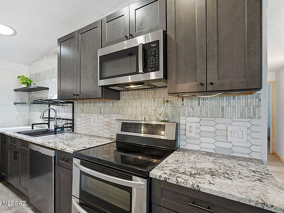 Your perfect opportunity awaits!This 4 bedroom, 2 bath home sits on nearly a quarter-acre lot with no HOA. The renovated kitchen features granite countertops and modern finishes, while new vinyl plank flooring flows seamlessly throughout the home.The primary bathroom has been completely remodeled and enlarged. A newer HVAC system adds comfort and peace of mind.Enjoy outdoor living on the covered back patio, overlooking a spacious backyard with raised garden beds, fruit trees, extra storage, and a dedicated play area. A perfect place for relaxation or entertaining.Nestled in a quiet cul-de-sac on Tucson's desirable Northwest side, this home is close to everything--shopping, theaters, schools, Pima College, libraries, hospitals, parks, and I-10. Solar lease to be assumed by buyer.