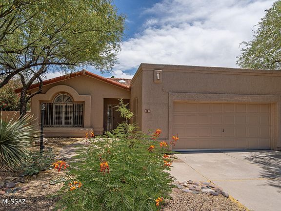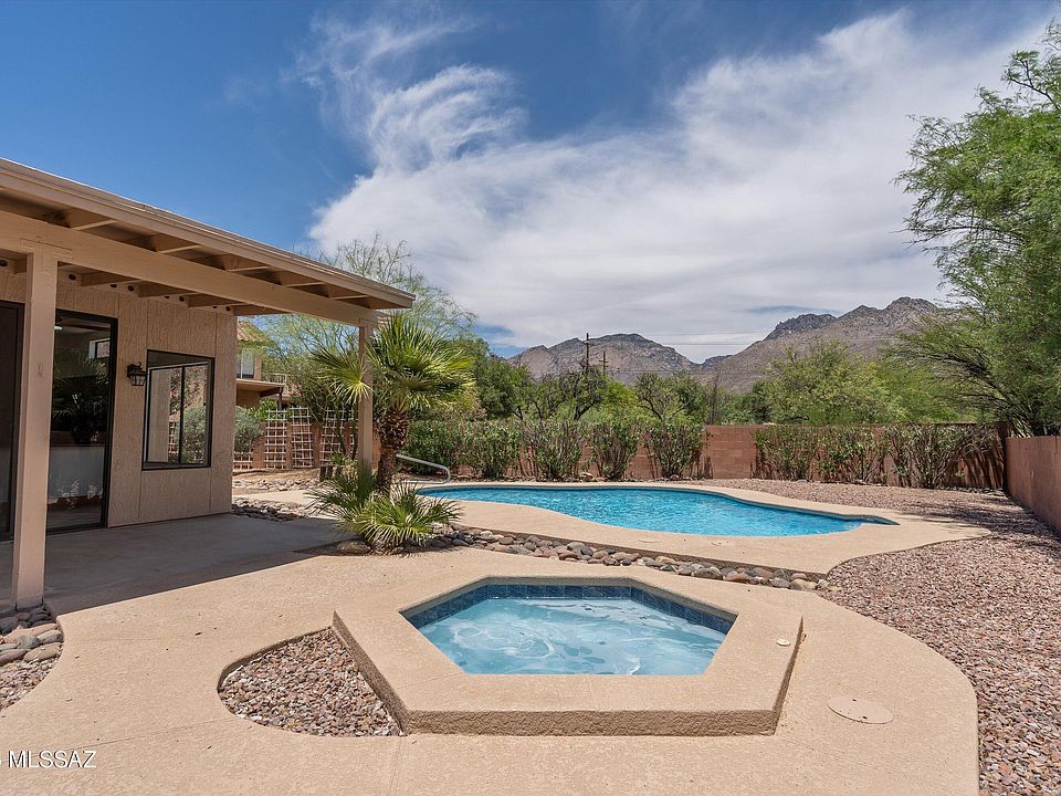 This stunning one-story 3-bedroom, 2-bathroom home is nestled in the desirable Catalina Foothills School District, situated in a peaceful cul-de-sac just a short stroll from Sabino Canyon. This home boasts soaring ceilings and exquisite polished Saltillo tile flooring throughout-no carpets here!The kitchen features sleek granite countertops and modern stainless steel appliances, including newer additions that enhance the culinary experience. The breakfast bar flows seamlessly into a spacious great room, where you can enjoy breathtaking mountain views and a cozy fireplace, creating the perfect ambiance for relaxation.Step outside to your beautiful backyard oasis, complete with a conventional pool and spa, as well as a covered patio that overlooks a serene greenbelt. Recently re-roofed.