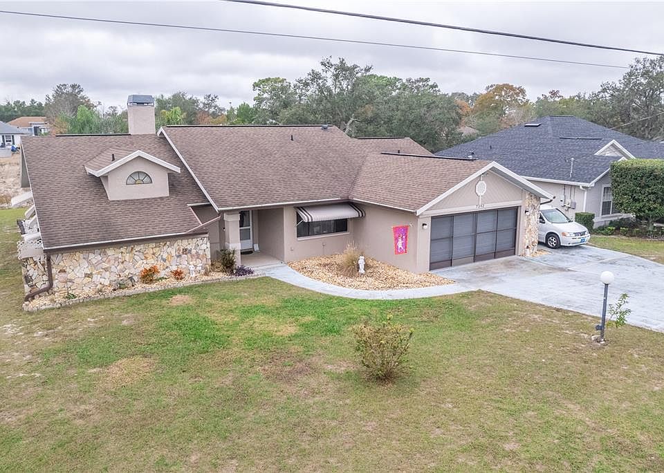 Welcome to this 2 bedroom, 2 bathroom 2 car garage home POOL home in Spring Hill. No HOA! The driveway is expansive and hold over 5 cars! Upon entering the double door entry, there is a spacious family room with cathedral ceilings and gas fireplace, The flooring is a 20" porcelain tile. There is a dining area to the front of the home and a large gallery kitchen that opens to the family room. There is also a large eat-in area for casual daily dining. The kitchen has granite countertops and updated kitchen cabinets. The kitchen also provides a pantry for storage. The main suite is to the left of the entry and approx. 12'X15', is light and bright with cathedral ceilings. There are sliders to the pool area from the main bedroom. The main bath has a walk in closet. The home is a split bedroom plan with the 2nd bedroom and bathroom on the opposite side of the home. There is a HUGE approx. 30'X10' enclosed lanai with block construction and windows that would make an incredible game room, 2nd family room or flex room. This room is not included in the heated/AC square footage for the home. It has a window unit AC for cooling. The home has a oversized pool deck that would be great for entertaining pool parties. The owner is leaving the 10'X10' cloth pergola on the pool deck. Just outside the screen enclosure is a wood deck for additional seating and entertaining. The pool does have a salt system. The home comes with tons of storage. There is a 10'X20' storage shed and a secondary 6X10 storage attached to the home. There is a large space between you and the rear neighbors so no one in your backyard! This is a well maintained home and ready for its next owner.