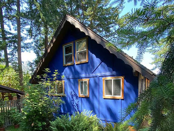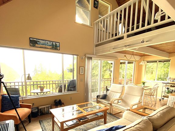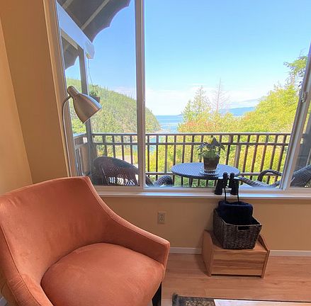 This Guemes Island gem is a secluded, furnished, contemporary Northwest-style 2-bedroom cabin with open living room, cozy gas stove, vaulted ceilings, skylights and a stunning view of the water, islands and mountains of the North Salish Sea.