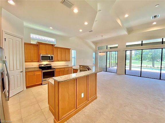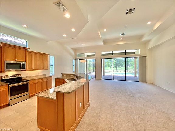Located in Lantana at Olde Cypress this 3-bedroom and 2 bath luxury home welcomes you to a bright and open layout with high volume ceilings, granite counters and stainless-steel appliances. A screened lanai with an extensive patio awaits with a private heated swimming pool & Jacuzzi which also gives access to a rich greenery from the golf driving range. The master bedroom offers 2 walk-in closets providing plenty of storage space. Additional features are the beautiful bay windows in the front rooms, dual zone air-conditioning, a spacious laundry room and an expansive garage with lake view across the street in the front of the home. Situated in in North Naples near shopping, dining, beaches and Interstate 75. Amenities offer the recently renovated 36,000 sq. ft clubhouse that offers fine dining and a golf course designed by the legendary P.B. Dye. Har Tru Tennis Courts, community pool, fitness center, outdoor dining at the Greenside restaurant/bar, and bocce courts.