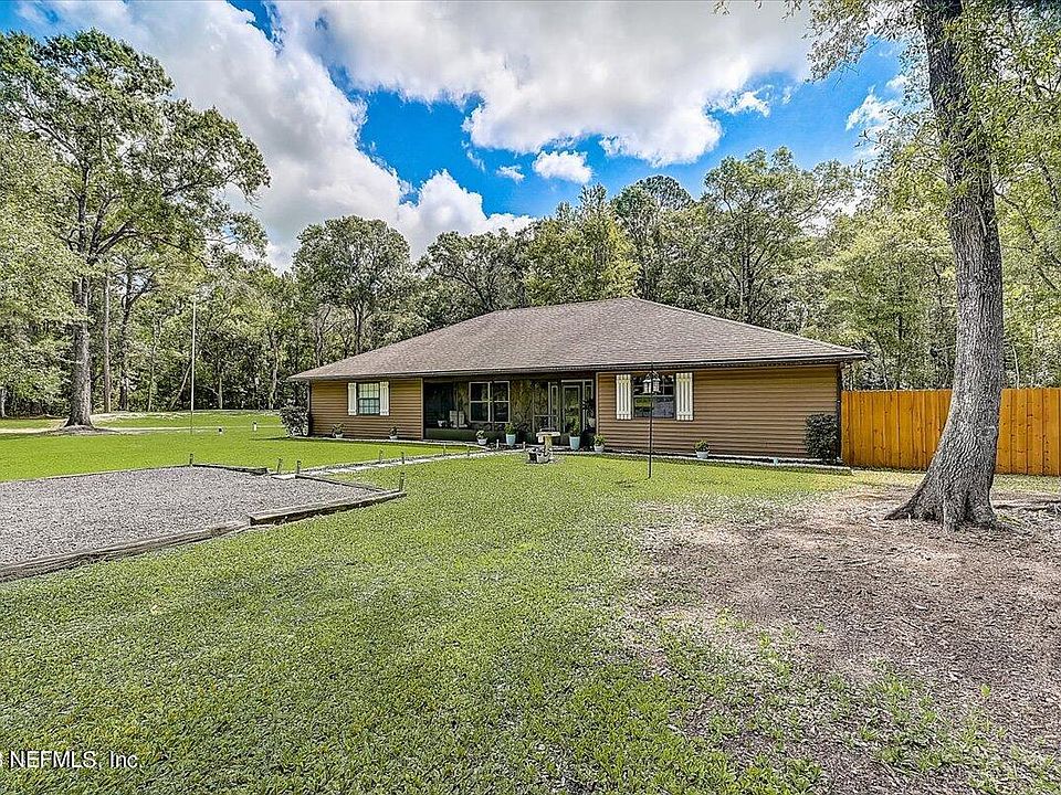 Private equine neighborhood in the country on 5 acres located in the private Old Nursery Plantation Community. This home offers an open floorplan with plenty of space. Features include a large family room for entertaining. Kitchen with lots of cabinet space with dining area, custom book shelves in dining. Large master bedroom with his & her walk-in closet; master bath has a garden tub & separate shower and his & her vanity sinks. Screened front porch for you to relax and drink your morning coffee. Storage shed for your equipment & metal carport for boat or RV parking. New fencing for your animals. Wood deck ready for family cookouts. Small creek located on property. Septic and Leech field just two years old and a new water softener system.