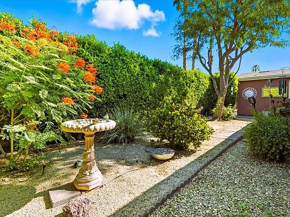 Contemporary & spacious Desert Oasis awaits its new owner. 55+Gated Golf Country Club living. Over 1900',this home has a great open floor plan with vaulted ceilings, dry-wall, gorgeous remodeled kitchen, large family room, 2 primary bedrooms with their own baths, attached 2-car garage & a wonderful backyard. The gourmet kitchen has been recently remodeled with designer cabinets, quartz counters & Island, stainless steel appliances. The recessed & custom lighting with the modern charcoal cabinetry is stunning. The kitchen is open to both the formal dining or extra lounge area and a large great room with custom cabinetry, plantation shutters, wet bar & track lighting. The entry way living room is currently an artist retreat with plantation shutters, high ceilings & windows looking out to the landscaped front yard. You will love the primary bedroom with double walk-in closets & the remodeled bath with recessed lighting, tile shower, dual sinks & quartz counters. Guests will love the privacy of their own en-suite bath as well. Plenty of room in the laundry with sink, storage & room for your computer work station. The backyard is special! A private Oasis with covered patio enclosed with sliding screen doors opening to the lovely garden area shaded by a private ficus hedge. Plenty of room for your canine or feline pals. A special bonus - At one end of the patio is a separate custom Arts & Crafts Studio - And don't forget the 2-car garage with plenty of extra storage room. Portola CC is an active community with pickle ball courts, 3 pools, newly remodeled clubhouse with Pub & a beautiful 18-hole par three golf course where play is included in the low HOA fee. Home is on a permanent foundation for ease of financing. You also own your land in Portola which protects the future value of your home. Great location near all the shops & restaurants of El Paseo, Palm Desert Community Park with shaded walkways, ponds, & dog parks. Close to McCallum Theatre with its year-round shows & entertainment & nearby Eisenhower Medical Center. Come take a look at why so many are choosing Portola CC as their choice for a great Desert Living lifestyle.