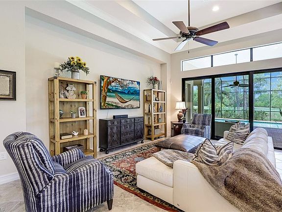 See the HD and 360 WALK-THRU VIDEOS. One of the Best Views in this professionally decorated and meticulously maintained San Remo Home. Great open floor plan with high ceilings, crown molding, carpet and tile with designer fixtures. Two Double sliders open to the beautiful huge pool and screened lanai. Stainless Steel appliances, granite counters, large pantry and light and bright with center Island perfect for dining and entertaining. There are Storm Smart Kevlar roll-down shutters that supply shade and weather protection. This home has a large over-sized garage and extended private lanai with wonderful year round sunsets with a huge POOL. Enjoy the Olde Cypress Country Club pool, fine dining, outdoor restaurant with planned activities all year. The P.B. Dye designed golf course has optional Golf Memberships. Enjoy playing tennis, pickle ball and use the large on site exerciser facility. Lantana at Olde Cypress is located withing easy access to I-75 to catch your next flight from RSW Airport and within 15 minutes to the Beach/Gulf. Shopping and Dinning are short walk or bike ride away.