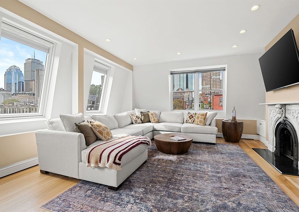 This PH duplex offers 3 exposures providing tremendous light, openness, & soaring city views. The open concept living & dining areas feature 6 updated windows, built-in shelving, & a fireplace with a restored marble mantle. The new kitchen features floor-to-ceiling windows, custom cabinetry, quartz counters, a Thermador gas range, microwave, & dishwasher, a Sub-Zero refrigerator, & a breakfast bar. The primary bedroom has a corner exposure & an exposed brick wall. The second bedroom has built-in shelving, a large closet, & a W/D. Completing this floor is a full bath with a custom vanity, a soaking tub, and a tiled shower. A special feature of this penthouse unit is the head house/ office leading to the oversized private roof deck. Other features include: refinished HW floors, new forced air heating/cooling, recessed lighting, & interior paint. This professionally managed condo is just steps from shops, restaurants, rental garage parking, public transportation, & all Boston offers.
