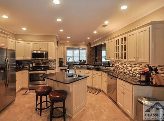 - Kitchen Features: Island, Custom Cabinetry, Pantry, Extra Sink, Solid Surface Countertop, Other-See Remarks, Back Splash
