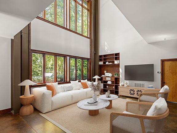 The two-story south-facing windows are a showpiece of the home, allowing beautiful natural light and passive solar function. Stained concrete floors throughout the main floor are attractive and functional, retaining warmth from the winter sun and cool underfoot in the summer. Built-in, recessed shelves in the living room are set up for entertainment tech. The open kitchen and dining area feature rich-toned cabinetry and concrete counters. Newer dishwasher (less than a year old); other kitchen appliances are NEW, including the refrigerator, microwave, and electric range with air-frying capability.