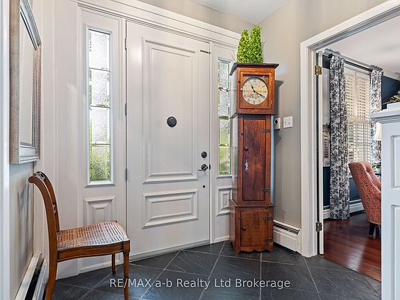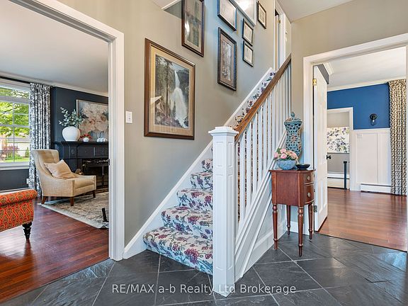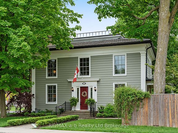 This Georgian-style manor is truly one of Aylmers showpiecestimeless, elegant, and beautifully updated from top to bottom. Sitting proudly on a fully fenced double lot, the property offers a private outdoor retreat with lush landscaping, two garden sheds, a covered porch, and a freshly painted exterior that enhances its classic curb appeal.Step inside to discover a perfect blend of historic charm and modern comfort. The updated kitchen shines with quartz countertops, a large island, and a bright dining nookideal for everyday family meals. For more formal occasions, the show-stopping dining room is ready to impress. The inviting living room, complete with built-in shelving and a wood-burning fireplace, creates the perfect gathering spot, while the main-floor office or den adds flexibility for todays lifestyle. Upstairs, youll find four spacious bedrooms, including a luxurious primary suite with a 3-piece ensuite featuring heated floors and a tiled shower. A full bathroom with integrated laundry adds everyday convenience. The finished lower level expands your living space with a cozy recreation room warmed by a gas fireplace. With economical heating and cooling, a durable metal roof, fresh paint inside and out, and thoughtful upgrades throughout, this move-in-ready home offers both sophistication and peace of mind.Dont miss the opportunity to own one of Aylmers most admired homes!