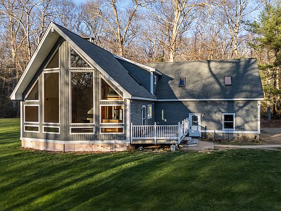 Uniquely private 1378 sq. ft. Contemporary situated on 12.7 acres! A private front driveway leads to a beautifully designed open-floor-plan home with a welcoming front / side deck. The front entrance opens majestically to the westerly facing, 2-story Great room with floor to ceiling windows, distinctive wood burning stone fireplace, and staircase access to the second-floor balcony. The adjacent open-walled Kitchen is equipped with granite countertops, stainless appliances, tasteful cabinetry, a fireplace insert grilling station and breakfast bar that leverages the impressive views through the Great room. The main floor also includes 2 bedrooms, a tiled floor laundry room, and a nicely appointed full common bath. The upper-level balcony leads to a large private Primary bedroom with built-ins, views and private full bath. The unfinished lower level provides the perfect backdrop for a potential recreation space and incorporates over 1100 sq. ft. The grounds are expansive and exceedingly private. They include an 1800 sq. ft. 2-story detached garage with plenty of space for vehicles, equipment or storage.
