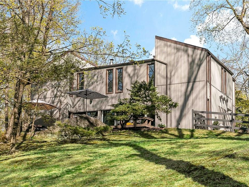 Exquisite and rare mid-century style home plus legal rental apartment on 1.75 bucolic fenced in acres. Beautifully renovated throughout featuring an open concept layout w/walls of glass, hardwood floors & striking beamed/planked ceilings. Dramatic living areas highlighted by custom kitchen w/Quartzite counters with door leading to two large decks for outdoor entertaining. Three bedrooms on second level include the spacious primary suite w/vaulted ceiling & updated primary bath. All systems have been updated. Large courtyard provides ample parking. Separate 2-story accessory building with kitchen, full bath and storage is a terrific asset for producing extra income. Frank Eliscu, the world renown sculptor whose credits include creating the Heisman Trophy, once lived here & used the space as his sculpting studio. Additional Information: Amenities:Guest Quarters,Storage,HeatingFuel:Oil Above Ground,