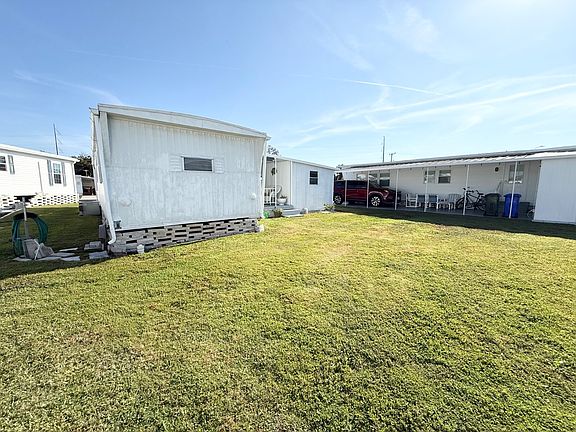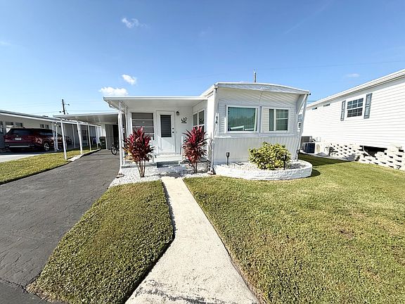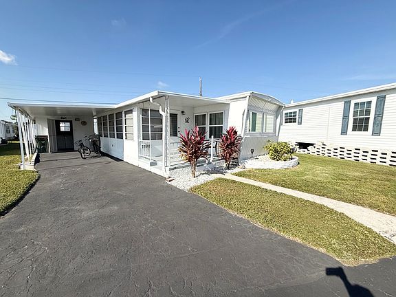 FULLY FURNISHED AND AS CUTE AS A BUTTON!!! This home is located in a wonderful 55+ gated community with very friendly neighbors! The lot rent is only $711 per month starting 2/2026 and includes water, lawn mowing and the use of the amenities! Some of the amenities include the use of heated pool, shuffleboard, bingo, billiards, darts, cards and arts and crafts just to name a few! The roof on this home is membrane and was sealed just 1 year ago. The central AC/heat unit has been maintained regularly and runs very efficiently. The home was tented for termites and is still under warranty. This warranty can be transferred to the new homeowner. The attached carport has room to park your vehicles. At the back of the carport you will find a very nice size storage shed to store your things along with a washer and dryer and large hot water heater. You will find 2 covered porch's on the home. One in the front and one in the back! What a great place to sit and read a book or sip on a cup of coffee or glass of wine. Step into the attached Florida room from the front porch and fine what is currently being used as a dining area and sitting room. This room could also make a great office, craft room, guest bedroom or whatever you wish to make it! The central AC/heat unit also connects to the Florida room and has a window AC unit in it for those extra hot days. During the winter months open all of the windows and enjoy the lovely Florida weather. Open the door from the Florida room and into the home and find a nice open floor plan! The living room is located at the very front of the home and has lots of windows allowing plenty of natural light into the home. Most of the windows in the home have been upgraded to double pane insulated windows! The kitchen is centrally located in the home and is open to the living room. The open concept of this home makes it great for entertaining. The kitchen unlike most has lots of cabinets. As you head down the hallway toward the back of the home you will find a hallway full of more cabinets with tons of storage. The main bathroom is nice in size and has a large walk-in shower. This bathroom was remodeled at one time. The door across the hall from the bathroom leads out to the covered back porch. The bedroom at the very back of the home has room for a king size bed if you wish, a built-in vanity/desk and plenty of other built-in wardrobes/closets. This home is very clean and has been extremely well maintained!! COME TAKE A LOOK FOR YOURSELF!!!