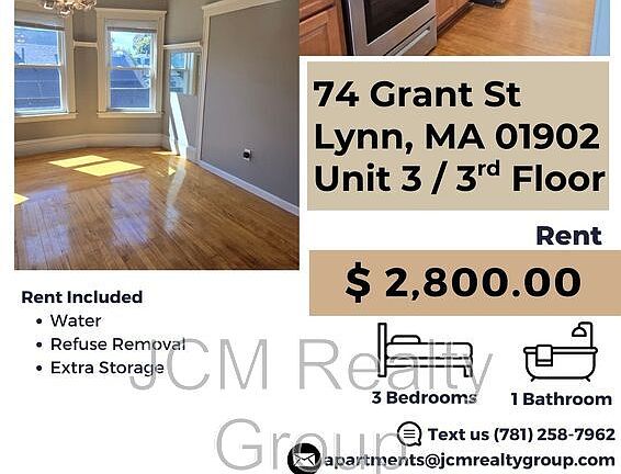 Available in Lynn!! Very spacious 3-d floor Apartment on a beautiful 3 family bulding! This top floor unit, offers 3 bedrooms, a large Eat-in Kitchen and an updated Bathroom. Newer kitchen cabinets, granite countertops and stainless steel appliances. Finished hardwood floors and large windows throughout the unit with tons of natural light, which make this a very bright appartment. Personal laundry in the building. One off street parkin spot! Short distance to the waterfront, city center, shops and restaurants. Very quiet neighborhood.