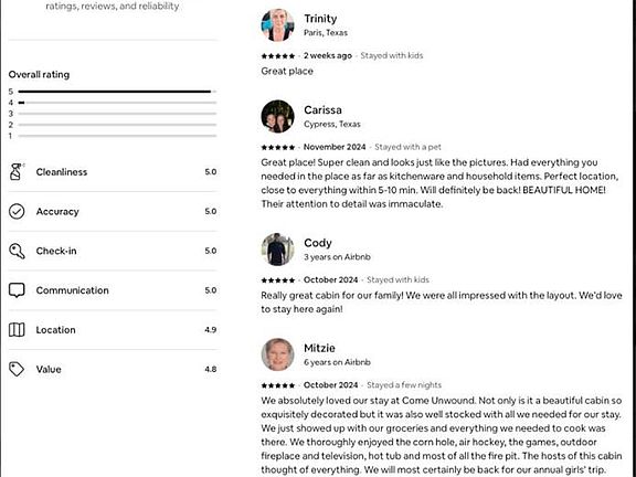 The thoughtfully designed kitchen simplifies meal prep with ample granite countertops, a deep sink for easy cleanup, and plentiful cabinetry to store all your essentials. Perfect for gatherings, the cabin comfortably sleeps up to ten guests across three well-appointed bedrooms. The first features a luxurious king bed and an ensuite bathroom with a shower, toilet, and dual sinks. The second bedroom also includes a king bed with its own ensuite bathroom. The third bedroom is ideal for groups, offering two queen beds and two full beds, paired with a bathroom featuring a tub-shower combo.