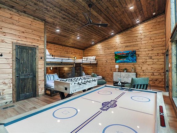 Outside, unwind in style with a cozy lounge area complete with a TV for entertainment. As evening falls, gather around the outdoor fireplace for marshmallow roasting and storytelling, with seating to ensure everyone feels included. End your adventurous day of hiking and boating the lake with a soak in the relaxing hot tub under the stars. Families will love the swing set, complete with a slide, two swings, and a climbing rope for endless outdoor fun. An EV charger is also available for added convenience, helping to draw in those vacation renters with electric vehicles.