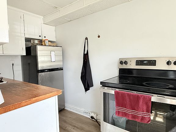 Kitchen with stainless steel fridge & stove, butcher block counters, and plenty of white cabinetry