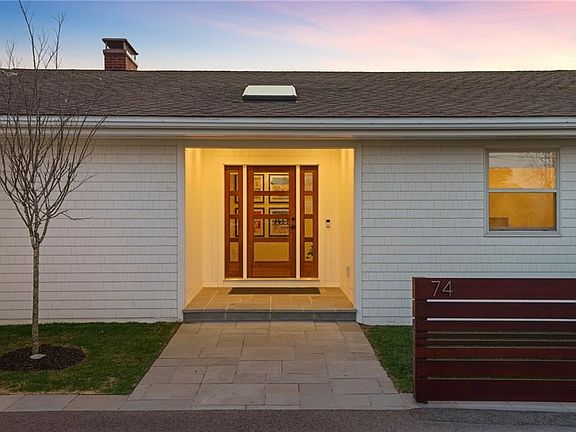 Settle in just in time for summer! 74 Honeyman Avenue is a thoughtfully renovated single-level home that blends comfort, style, and functionality. With 4 bedrooms and 3 full bathrooms, the layout is ideal for a variety of living arrangements. The open floor plan is highlighted by high-end finishes and premium Bertazzoni appliances, a gas fireplace, bespoke light fixtures, custom motorized window treatments, and multiple glass sliders that create a natural flow between indoor and outdoor spaces. The bright interior is perfect for everyday living or entertaining, while the finished basement offers flexible space for a TV room, gym, office, guest room, or play area. A seal-coated oversized 2-car garage leads into a welcoming mudroom with laundry, a sink, and additional pantry storage. Positioned on a full acre, the property offers room to expand your outdoor living — whether that means adding a pool, a patio, or simply enjoying the spacious lawn. The oversized west-facing deck offers peaceful sunset views, with a glimpse of the Newport Bridge providing a picturesque backdrop for relaxing evenings or memorable summer gatherings.