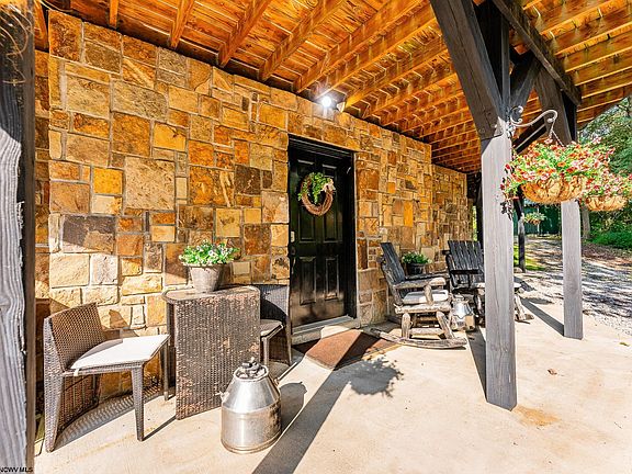 Grand stone fireplaceCabin wood flooringWooded acreageTwo garage areasBack porchNewer carpetPanoramic decking