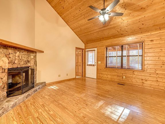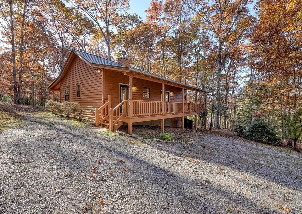 Charming and fully refurbished 2BR/2BA cabin nestled on a gentle, wooded lot with paved county road frontage and no HOA! Enjoy one-level living with a split bedroom floor plan and an open concept living and dining area—perfect for relaxing or entertaining. The cozy living room features a wood-burning fireplace, ideal for cool mountain evenings. The kitchen shines with new granite countertops, appliances, and fixtures. Freshly painted exterior, new HVAC, updated lighting, window treatments, and a refreshed gravel driveway make this home move-in ready. Both full-length front and rear porches invite you to take in the peaceful setting surrounded by nature. Located just minutes from Hwy 515 and beautiful Lake Nottely, this cozy cabin offers easy access, modern updates, and mountain charm — the perfect getaway or full-time retreat!