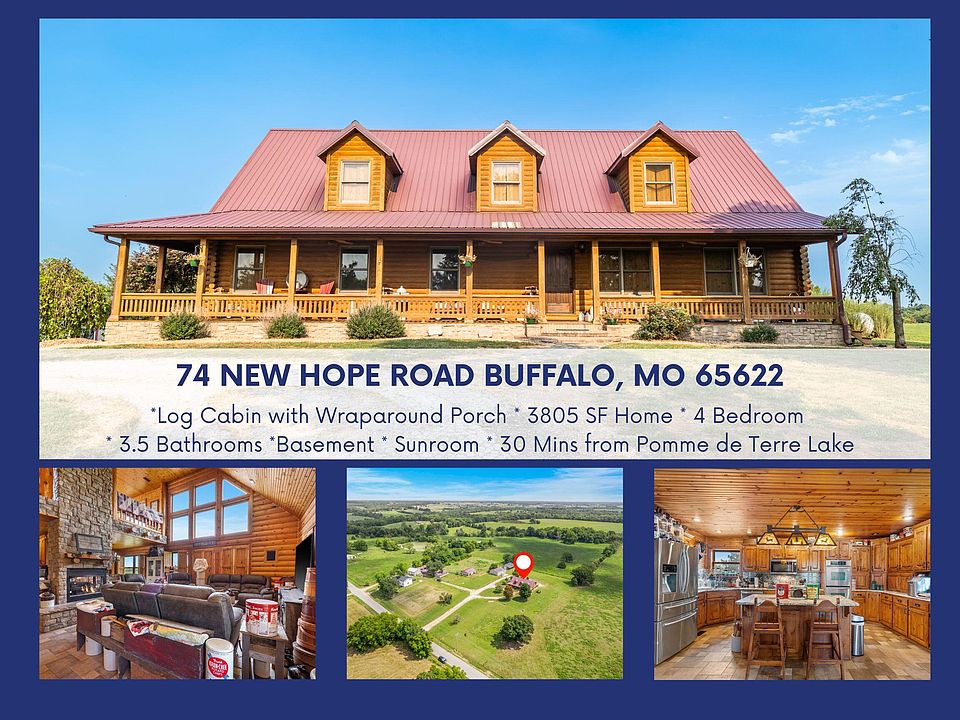 Step into rustic elegance with this beautifully crafted custom log home, built in 2006 and designed to impress at every turn. From the moment you enter, you'll be greeted by a stunning floor-to-ceiling stone fireplace, soaring ceilings, and rich wood tones that radiate warmth and character. Expansive windows fill the home with natural light, creating a welcoming atmosphere throughout.The gourmet kitchen is a chef's delight, featuring granite countertops, a walk-in pantry, a center island, and abundant counter space that flows seamlessly into the dining and living areas -- perfect for entertaining. Just off the dining room, the sunroom retreat with its own fireplace offers a bright, cozy escape for every season.This home offers 4 bedrooms and 3.5 bathrooms, including a luxurious primary suite complete with double sinks, a walk-in shower, and a jetted tub for ultimate relaxation. Upstairs, you'll find a spacious loft-style living area, two bedrooms, and a full bath, creating the perfect space for family or guests.The finished basement expands your options even further with a kitchenette, full bathroom, and room for a theater, game room, or additional living space. It's designed for rest, relaxation, and fun.Step outside to enjoy the sweeping wraparound porch, ideal for morning coffee or evening sunsets. The property also includes an oversized garage, a barn, and semi-finished guest quarters -- adding flexibility for visitors, hobbies, or even potential income.All of this is set on 4.55 acres of peaceful countryside, located less than 15 minutes from Buffalo and just 30 minutes to Pomme de Terre Lake.This isn't just a home -- it's a retreat, a gathering place, and a lifestyle. Come see this gorgeous property for yourself!