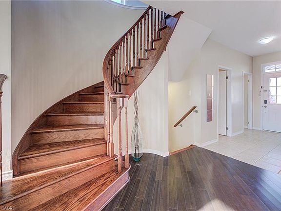 Walkout basementLarge full-size windowsOpen-concept layoutHardwood curved staircaseRich hardwood floorsStainless steel appliancesStone backsplash
